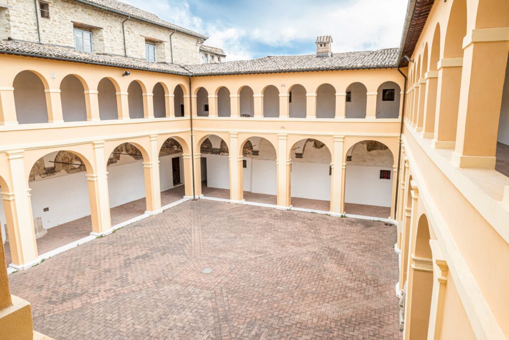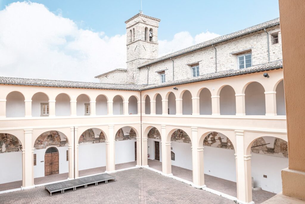 Il Chiostro di San Domenico fa parte infatti del complesso storico della Chiesa dei Santi Domenico e Giacomo, costruita nel 1291 su un antico oratorio dedicato a San Giorgio. È decorato con affreschi che raccontano episodi della vita del Beato Giacomo Bianconi da Bevagna, una figura centrale nella ricostruzione del paese dopo l’assedio delle truppe imperiali di Federico II.
